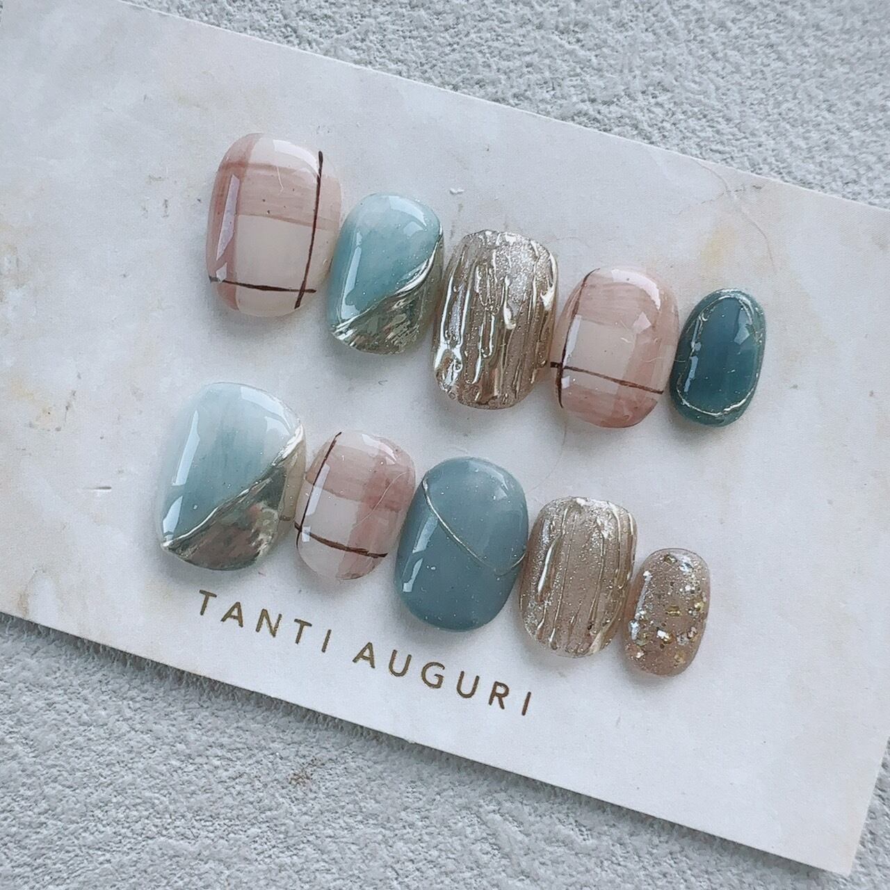 ターコイズブルー 藍鼠色 チェック ショートネイルチップ 水色系 格子柄 小さめ 短め 通販サイト 売ってる場所
