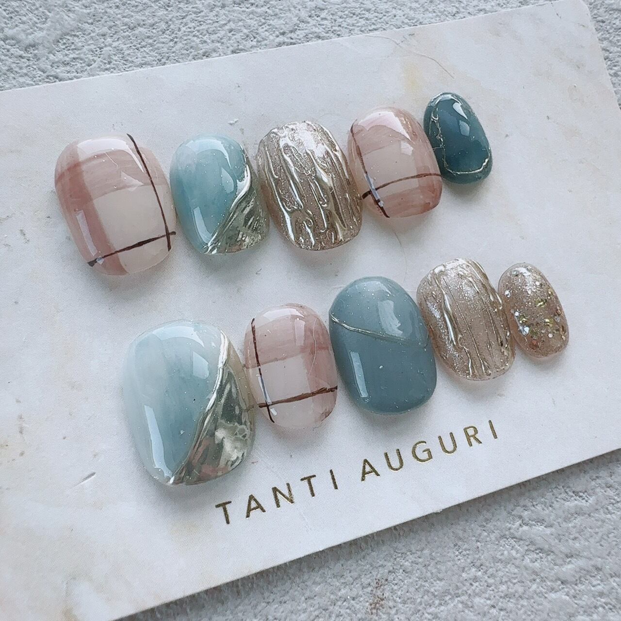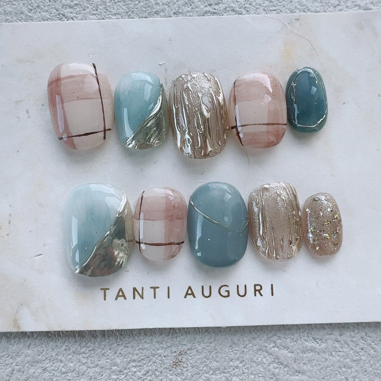 注意事項:●ネイルチップは1つ1つ手作業で作成しているためデザインやニュアンスが多少変わる事があります。●ご使用のブラウザや端末によってカラーが多少異なって見える可能性があります。●取り外し前提の商品です。付けっぱなしの状態で発生した事故や商品の破損、欠損について一切の責任を負いかねます。●過度な衝撃を加えたり折り曲げた場合にネイルチップが破損する場合があります。●サイズについては自身の爪のサイズを計測し自己責任でご購入下さい。◆チップのカーブは多少のバラツキがございます。お爪によってはチップのカーブとうまく合わず、フィットしないと感じられることがございます。その場合は接着グミを重ねるなど厚みを出して装着することをおすすめしております。